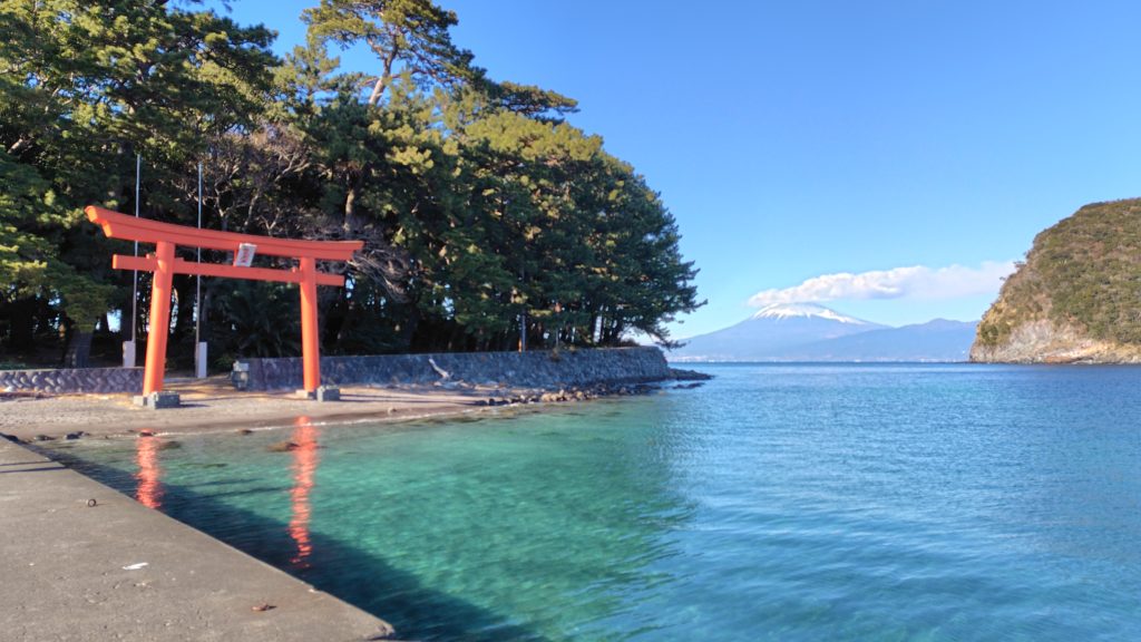 西伊豆の戸田にある戸田湾には砂嘴があり、御浜岬として有名だ。この先端には諸口神社があり、湾内から神社の鳥居と富士山を眺めることができる絶好のポイントだ。